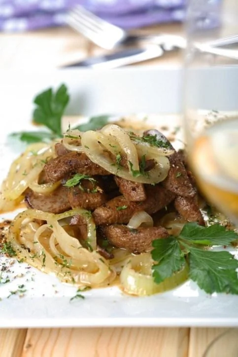 ШАГ 5 Порежьте мясо на куски, разложите по тарелкам и полейте кремом и выложите лук. Украсьте веточками тмина. Подавайте с картофелем.