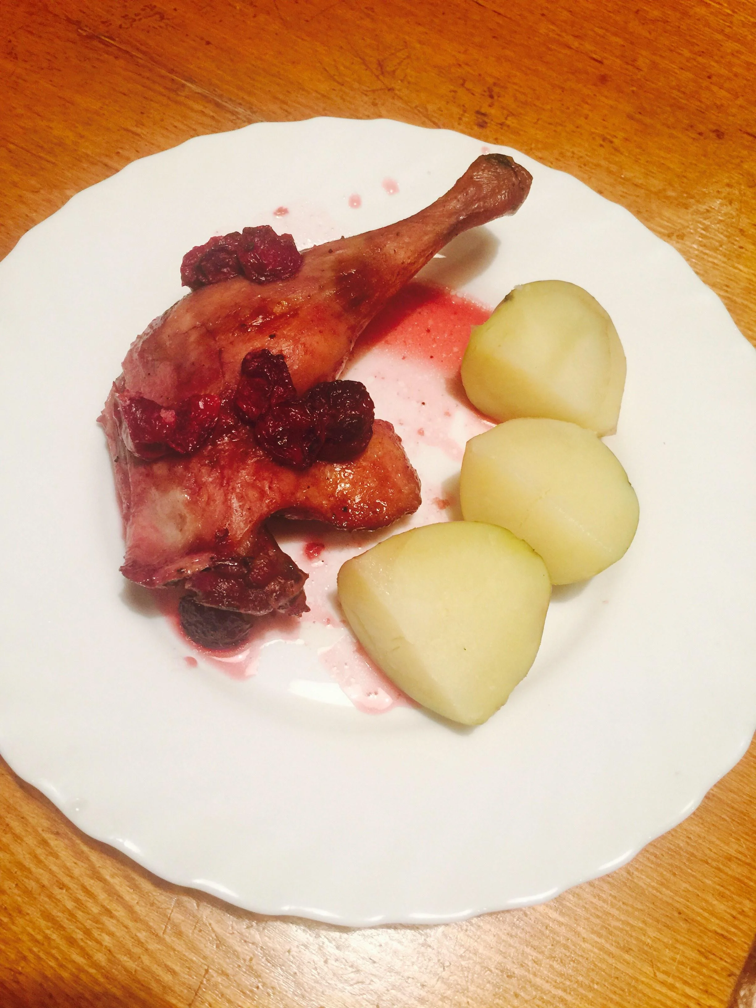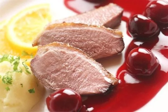 ШАГ 2 Вишни без косточек потушить в красном вине, за 10 минут до готовности утки полить ее вином с вишней, еще раз посолить и поперчить.