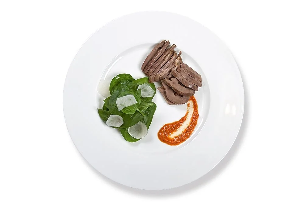 ШАГ 4 Вскрыть пакеты, вынуть сердца, быстро обжарить их на гриле — просто чтобы получилась красивая корочка. Затем нарезать тонкими ломтями, выложить на подушку из перечного соуса. Вокруг сердец аккуратно уложить салат, щедро полить соусом, посыпать мальдонской солью — и подавать.