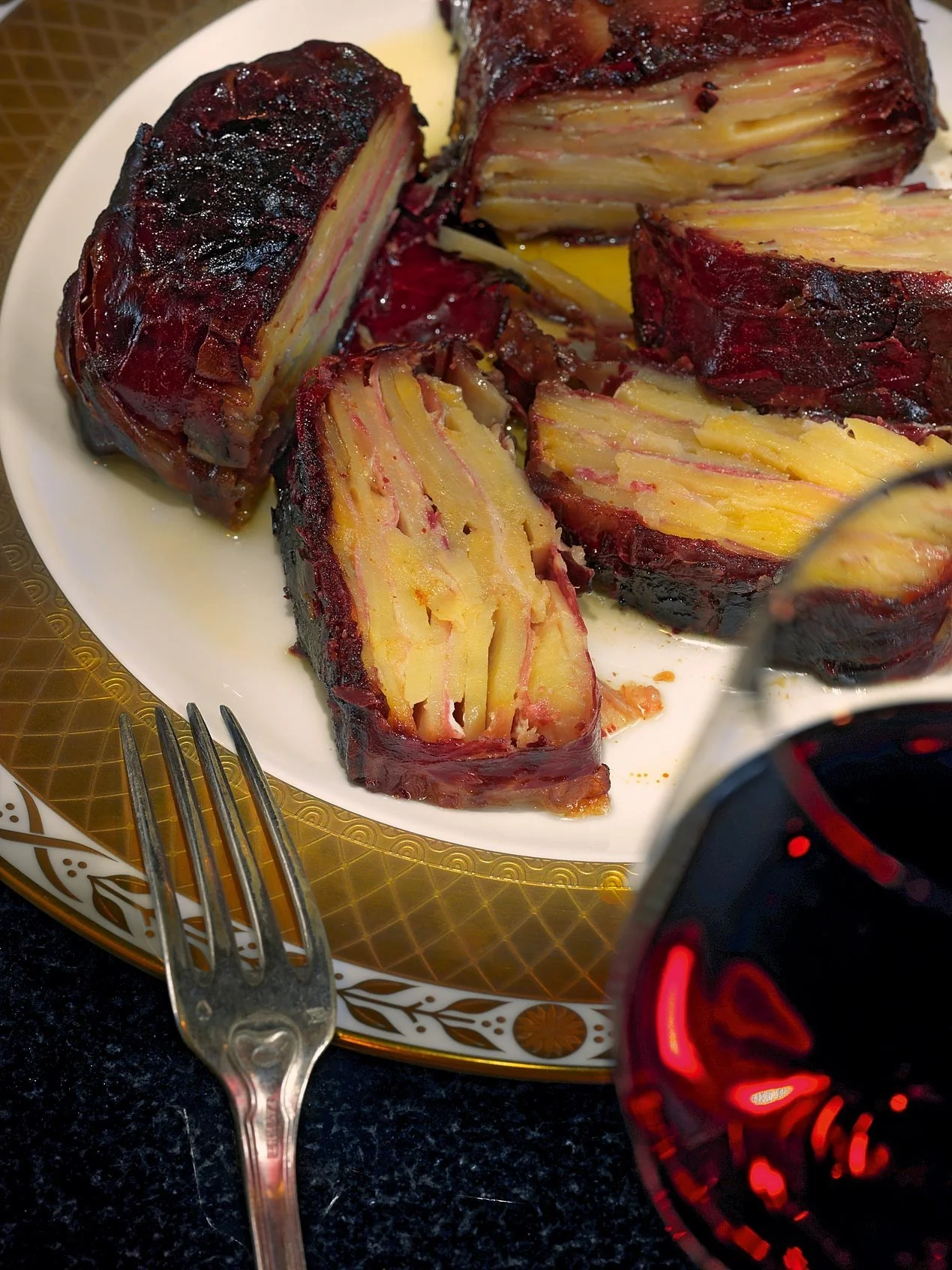 ШАГ 4 Получившуюся конструкцию плотно закрыть ушами бекона. Основательно запечатать форму для выпечки фольгой — лучше в два слоя. Отправить мильфей в разогретую до 180 градусов духовку часа на полтора, а потом достать форму, снять фольгу и вернуть пирог в духовку на десять минут — подрумяниться.