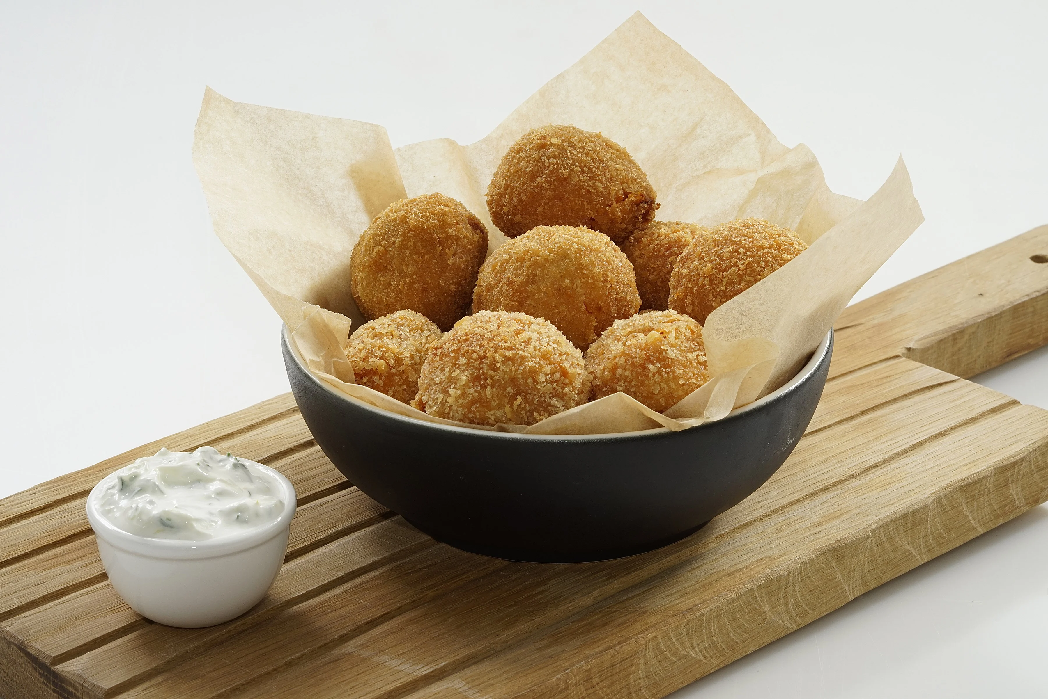 ШАГ 6 Сделать углубление в крокете, вложить в центр кусочек сыра, сформировать шарик. Проделать то же самое с остальными крокетами.