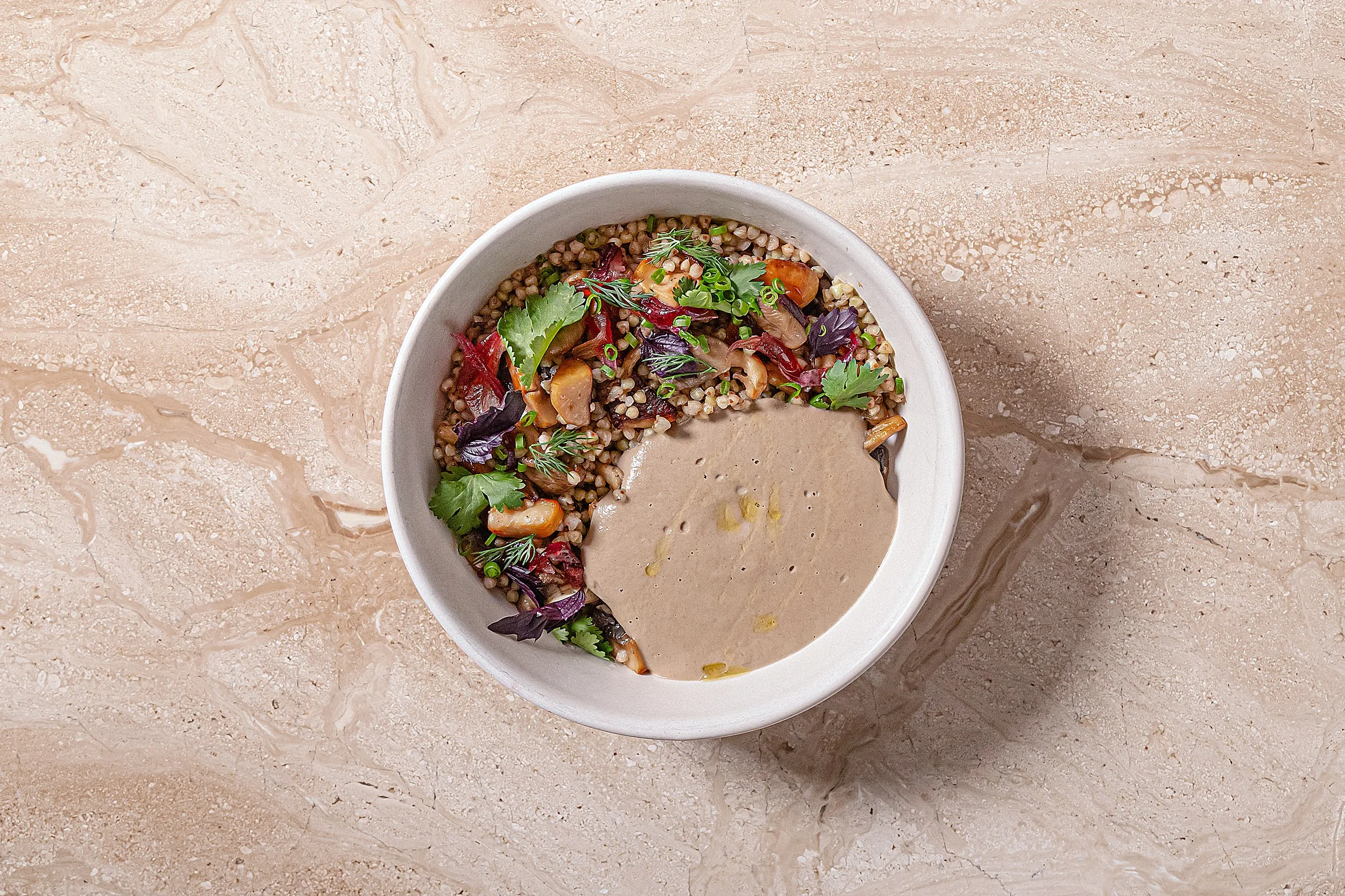 ШАГ 11 Собрать блюдо. В боул положить гречку с грибами, сбоку полить грибным соусом. Украсить соцветиями укропа, зеленым луком и листочками петрушки.