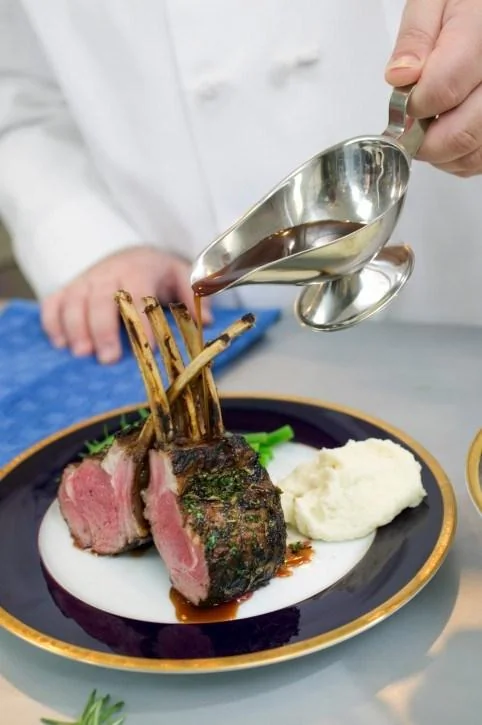 ШАГ 6 В сковороду добавьте говяжий бульон, 1 измельченный зубчик чеснока и веточку тмина и мясной сок из противня. Доведите до кипения и варите 5-8 минут до состояния соуса. Перелейте в соусник и подавайте с мясом.