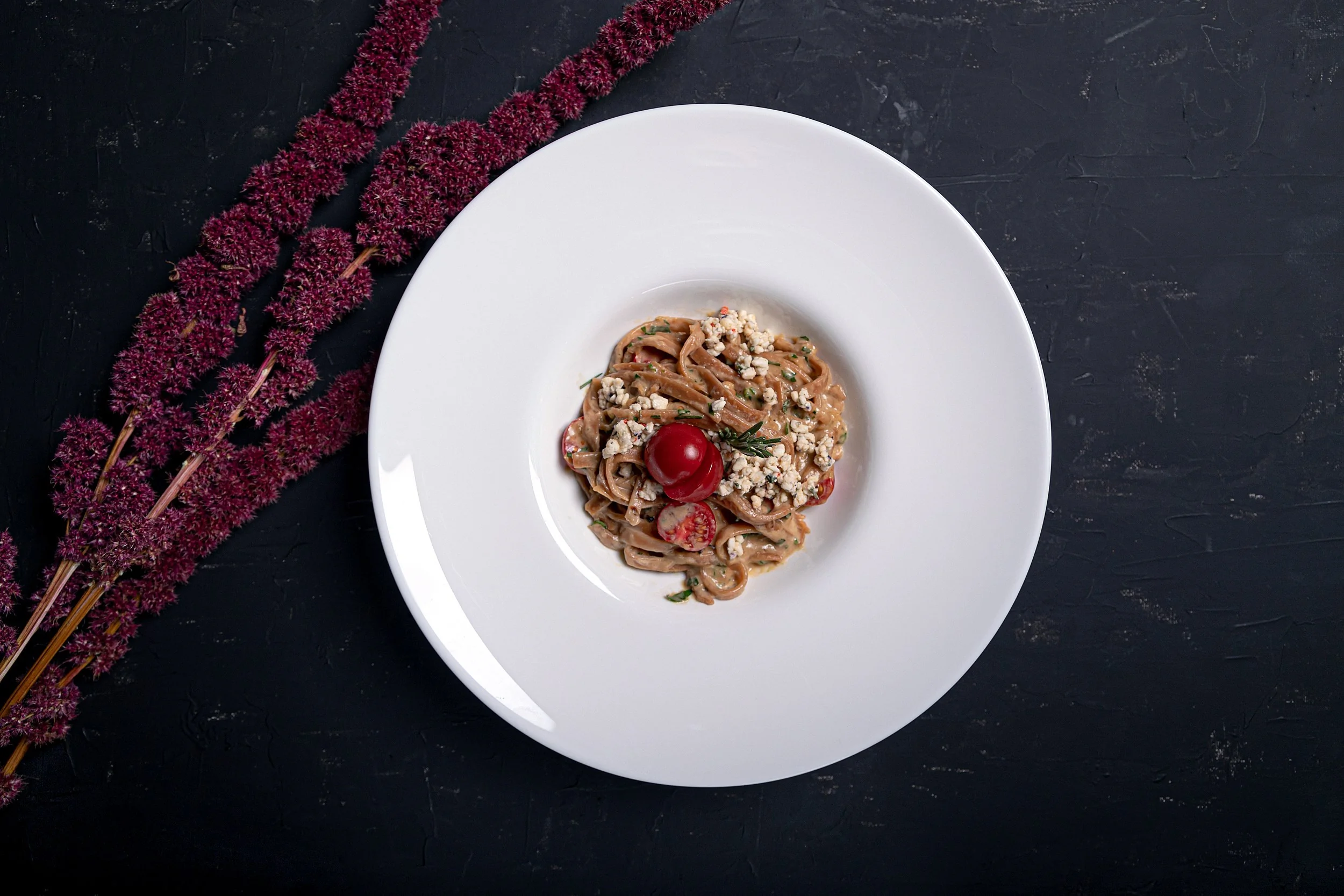 ШАГ 10 Выложить пасту в тарелку, сверху посыпать сыром и украсить половинками черри.