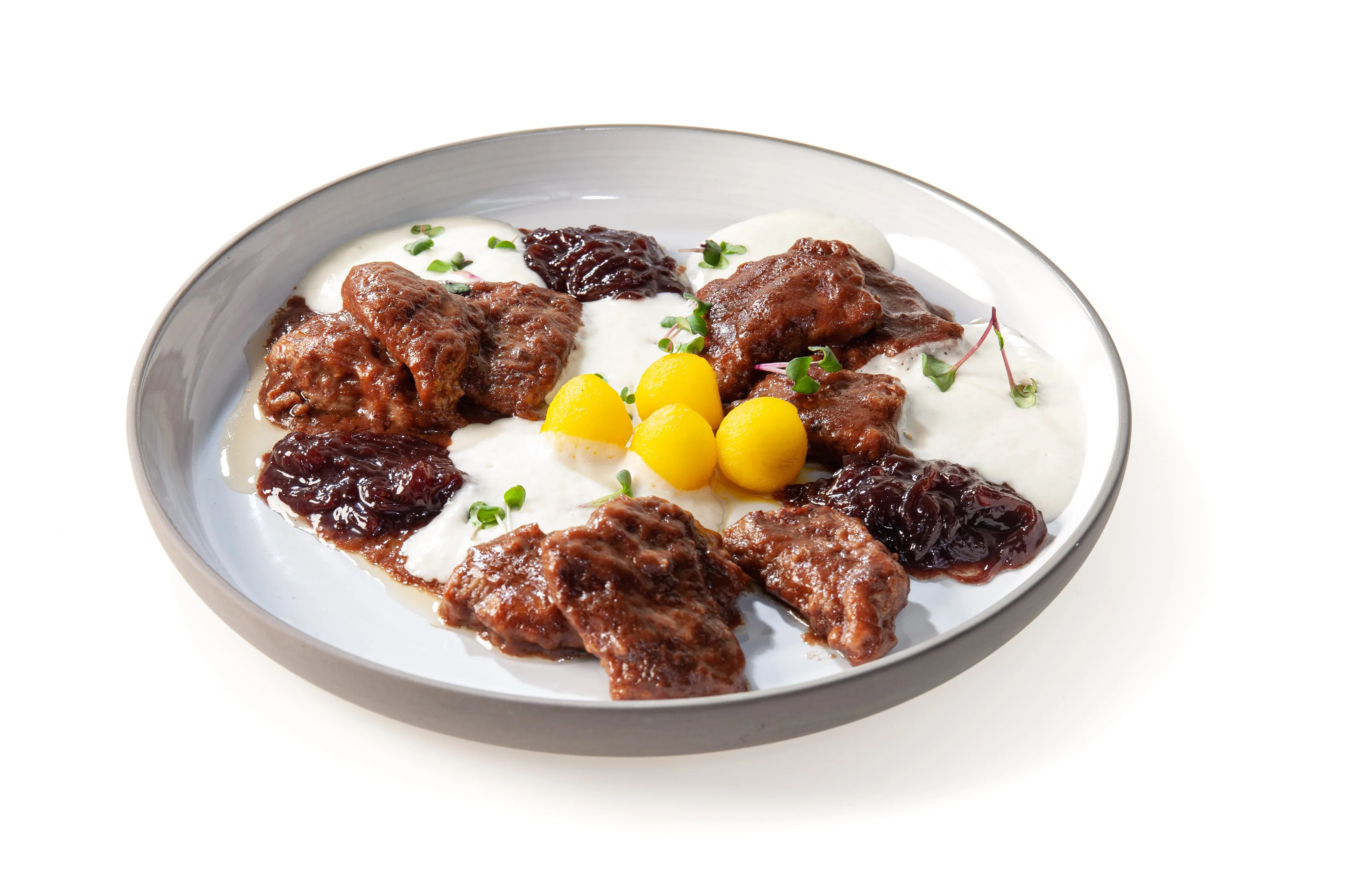 ШАГ 16 На тарелку для подачи выложить печень с соусом, рядом выложить шарики груши, карамелизованный лук, мусс из пармезана и украсить микрозеленью.