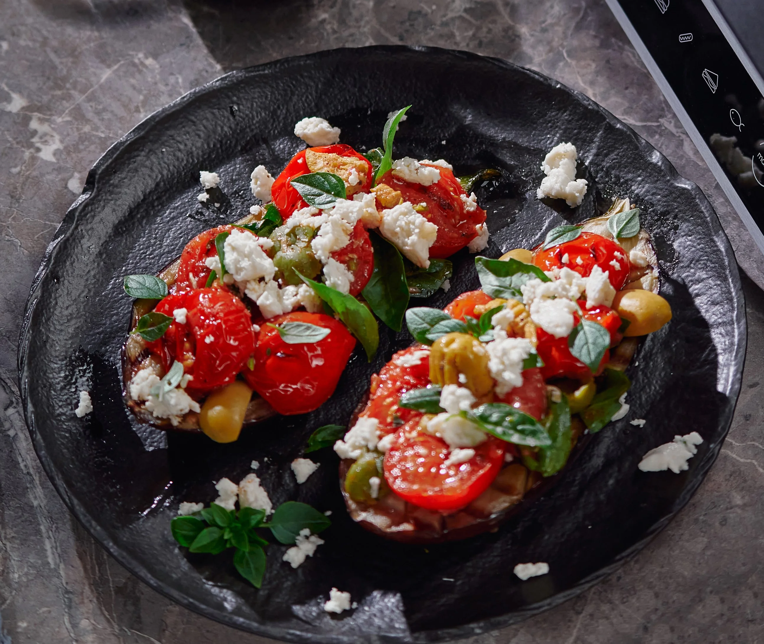 Баклажан на гриле с томатами и греческим сыром