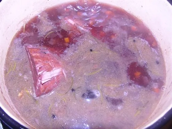 ШАГ 2 Нарезать мелкими кубиками морковь, лук, сельдерей, совсем мелко нарезать имбирь и обжарить в сковороде на растительном масле до яркого запаха и легкого карамельного цвета овощей. Пересыпать жареные овощи в глубокую кастрюлю, залить бульоном и вином, бросить туда же перец горошком, розмарин и лавровый лист, довести до кипения, сильно убрать интенсивность пламени и тушить до тех пор, пока не прозвенит сигнал, что свиная шейка в духовке уже час. Тогда переложить шейку с противня в кастрюлю и тушить еще полтора часа на медленном огне.