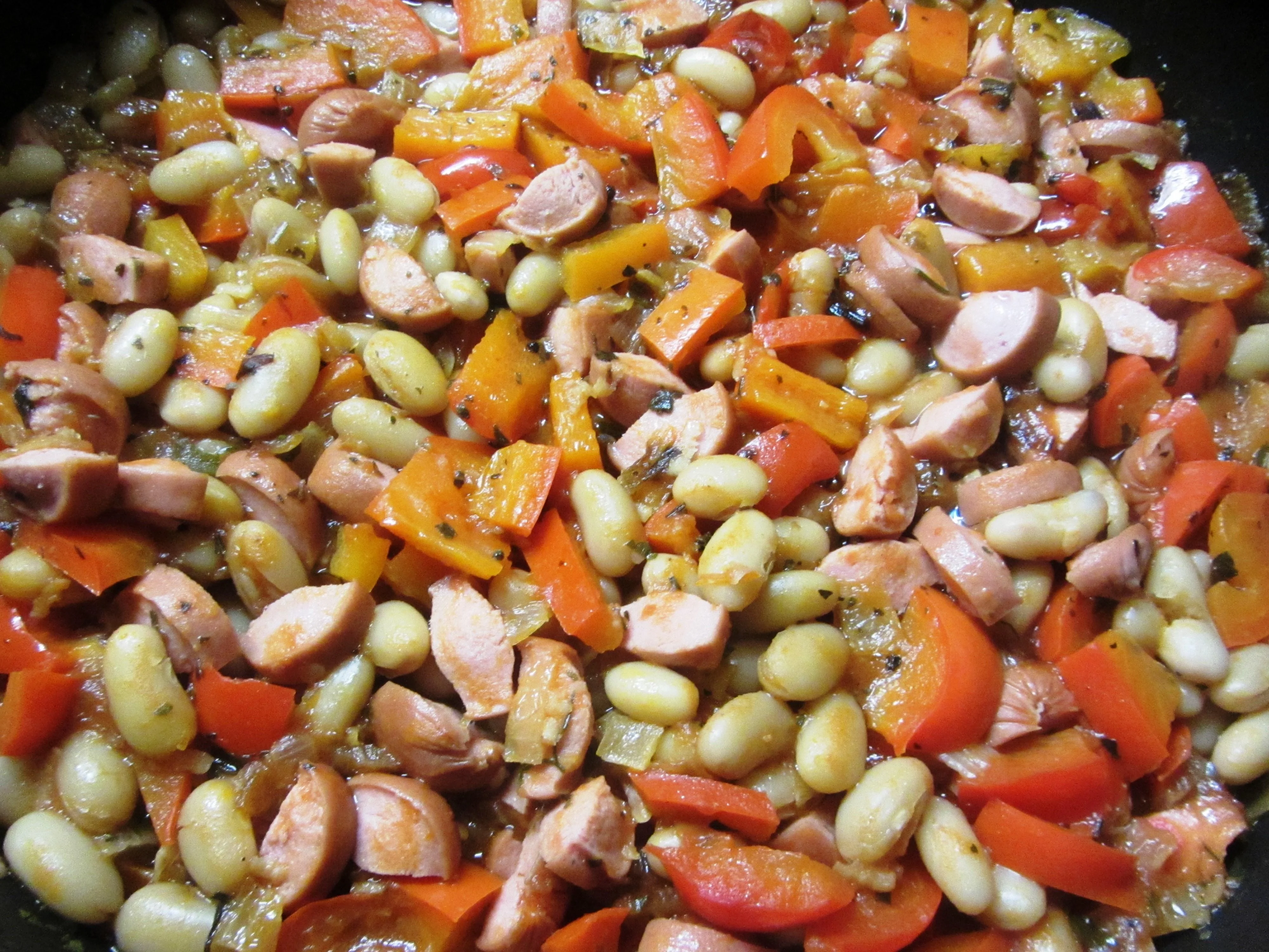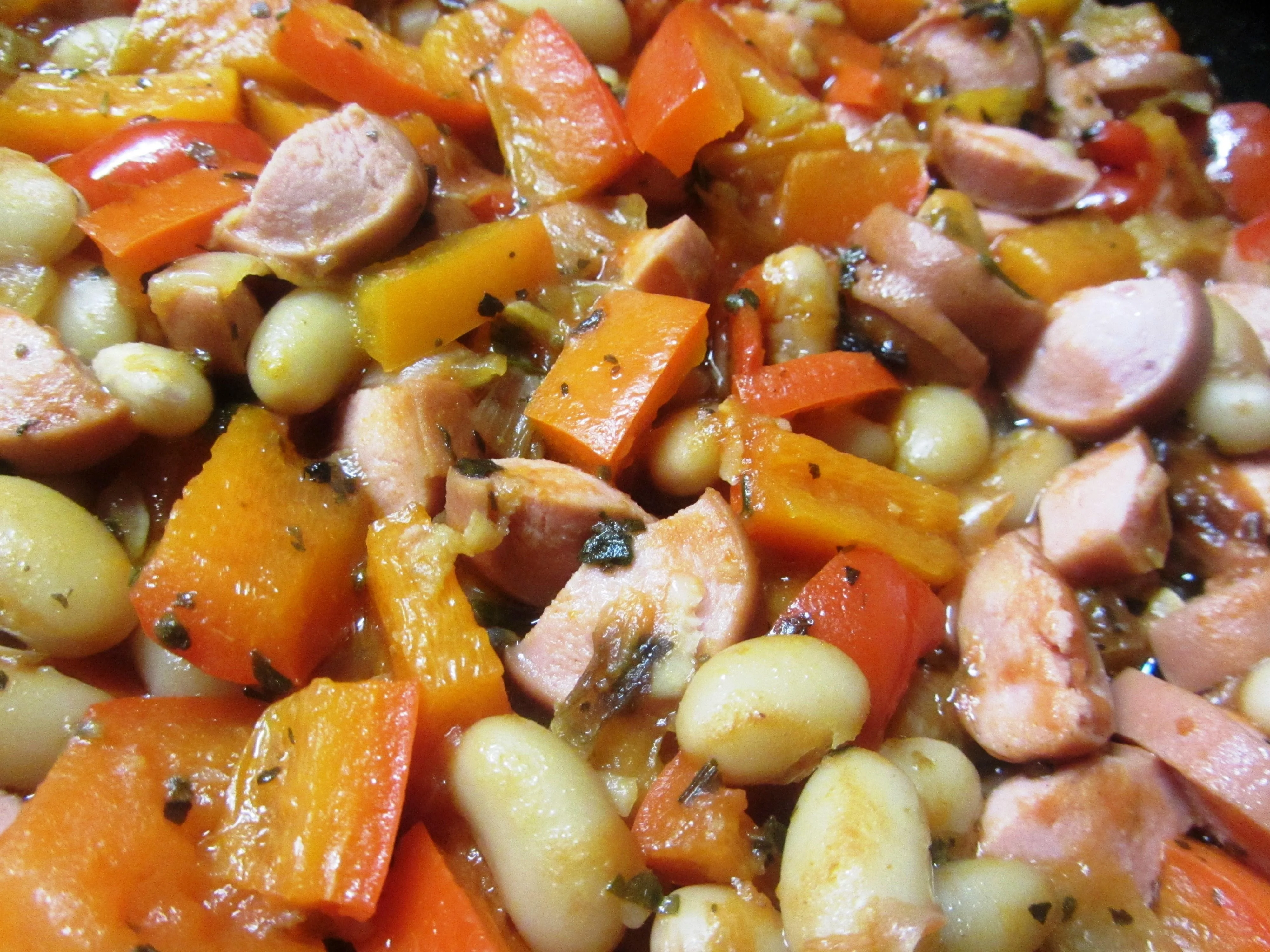 Гуляш с копчеными колбасками, фасолью и болгарским перцем