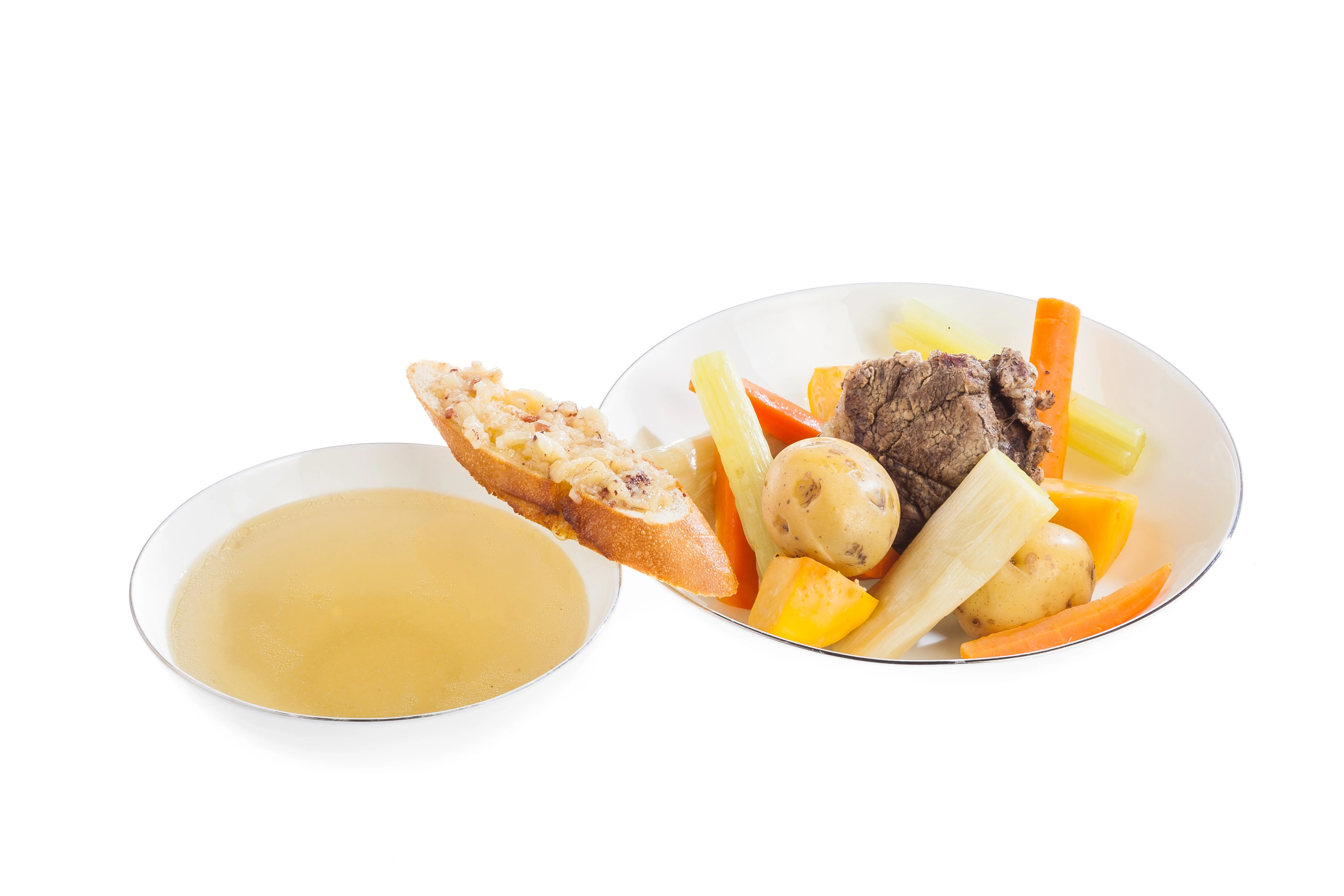 ШАГ 11 В большие тарелки выложить вареные овощи и кусочки мяса, а в небольшие глубокие тарелки разлить насыщенный мясной бульон.
