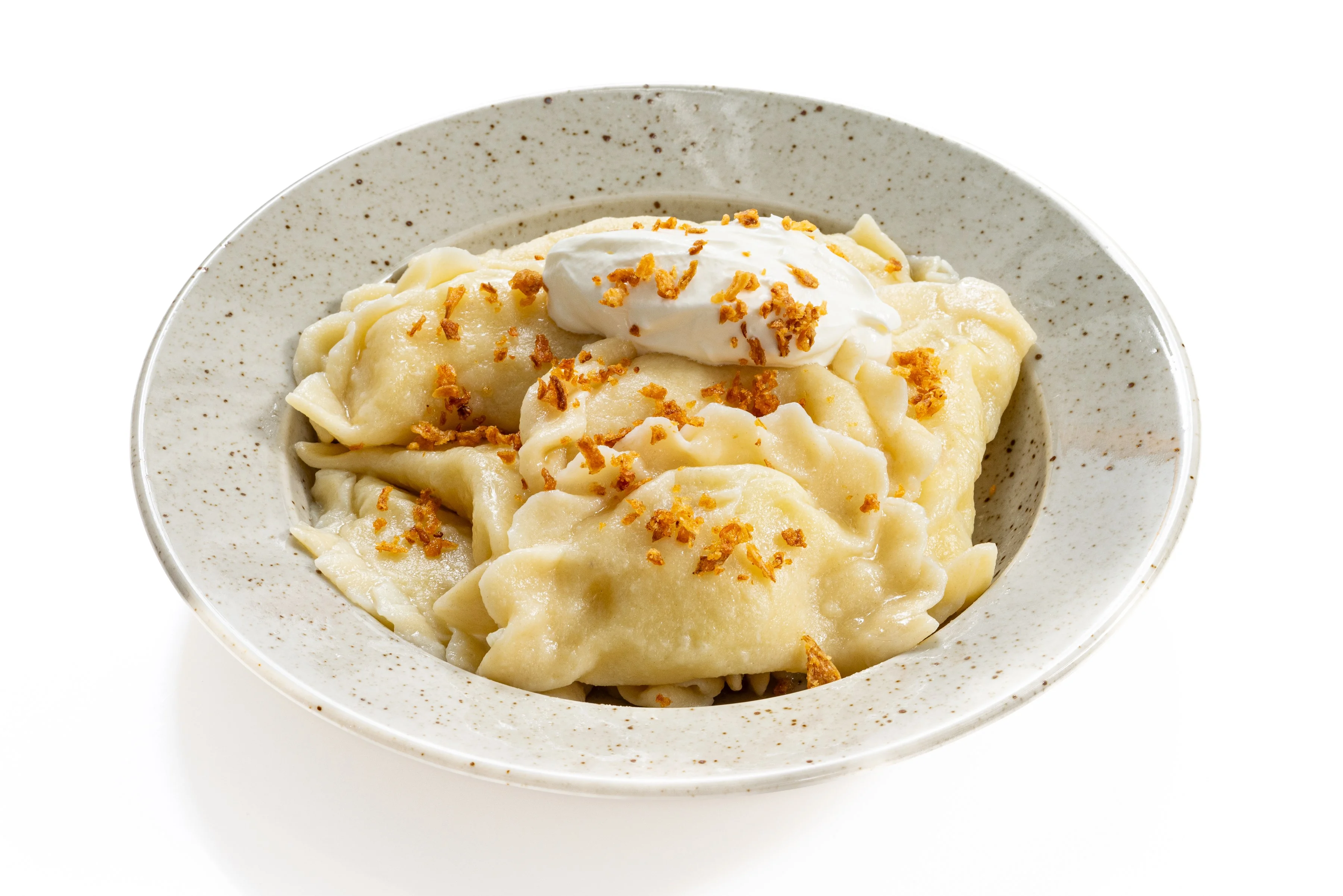 ШАГ 12 Вареники с картошкой подавать со сметаной, посыпав луком фри при желании.