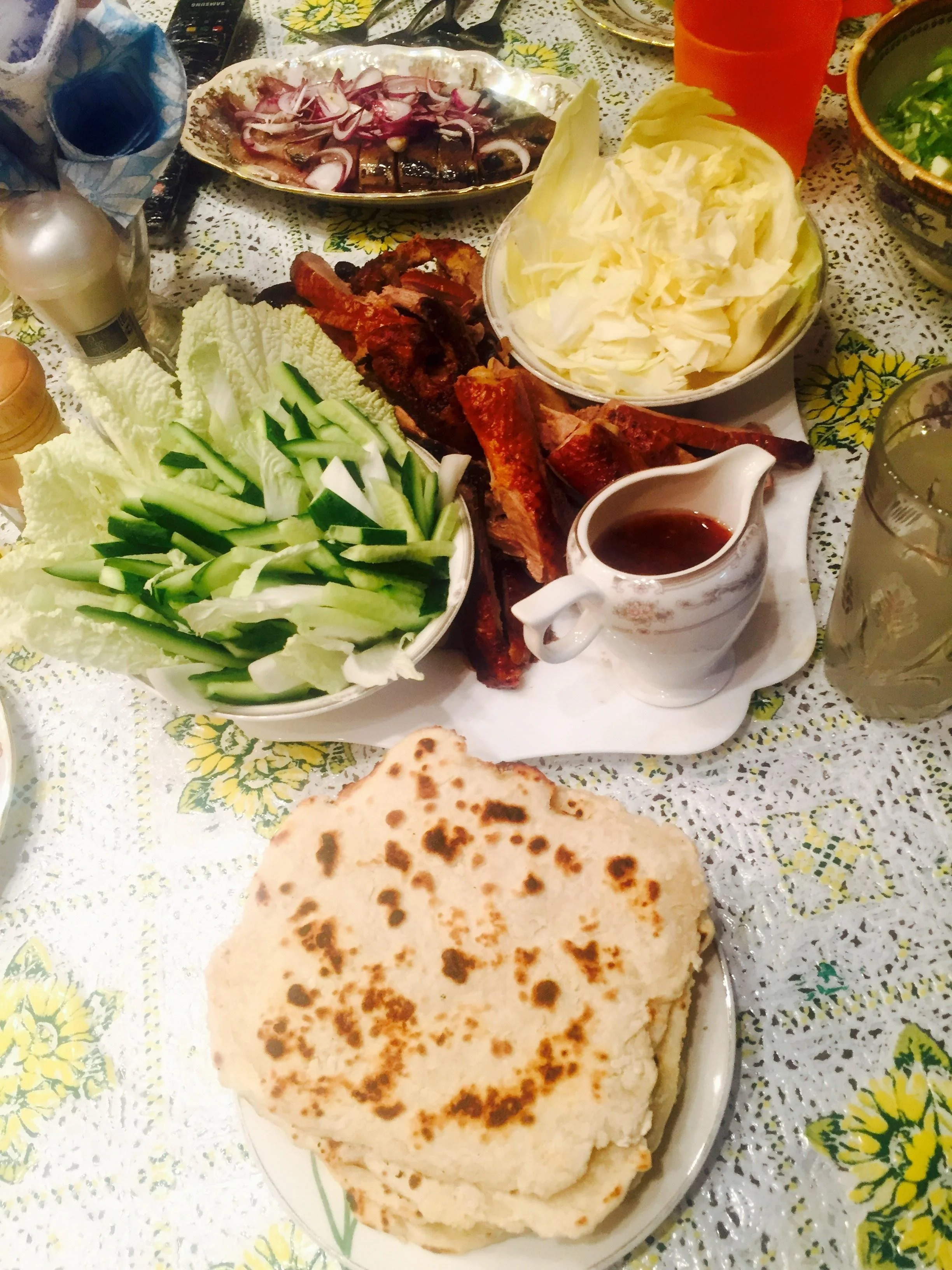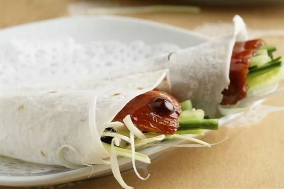 ШАГ 9 Во время трапезы, кусочки утки заворачиваются в блинчики смазанные соусом хойсин вместе с луком и огурцом.