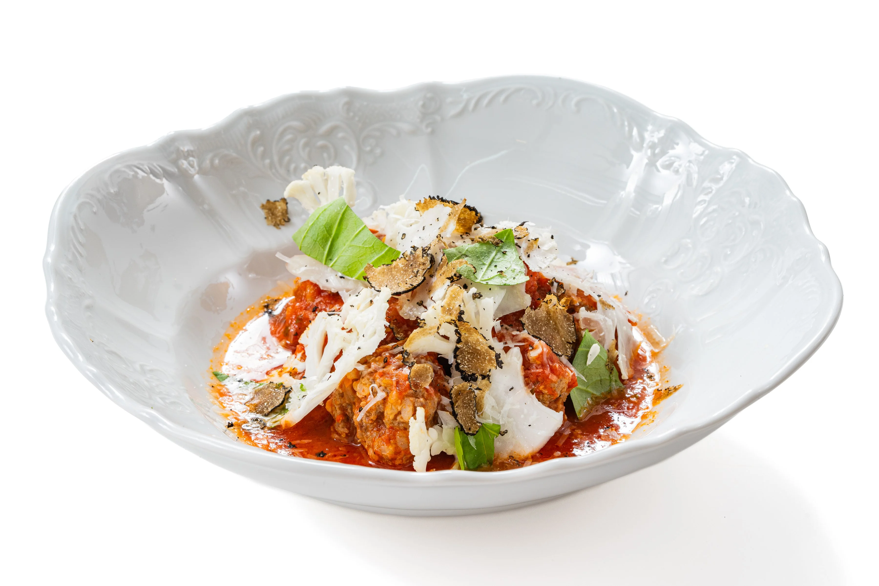 ШАГ 11 Выложить тефтели с соусом на тарелку, на них выложить цветную капусту, листья базилика, посыпать тертым сыром и при желании ломтиками трюфеля.