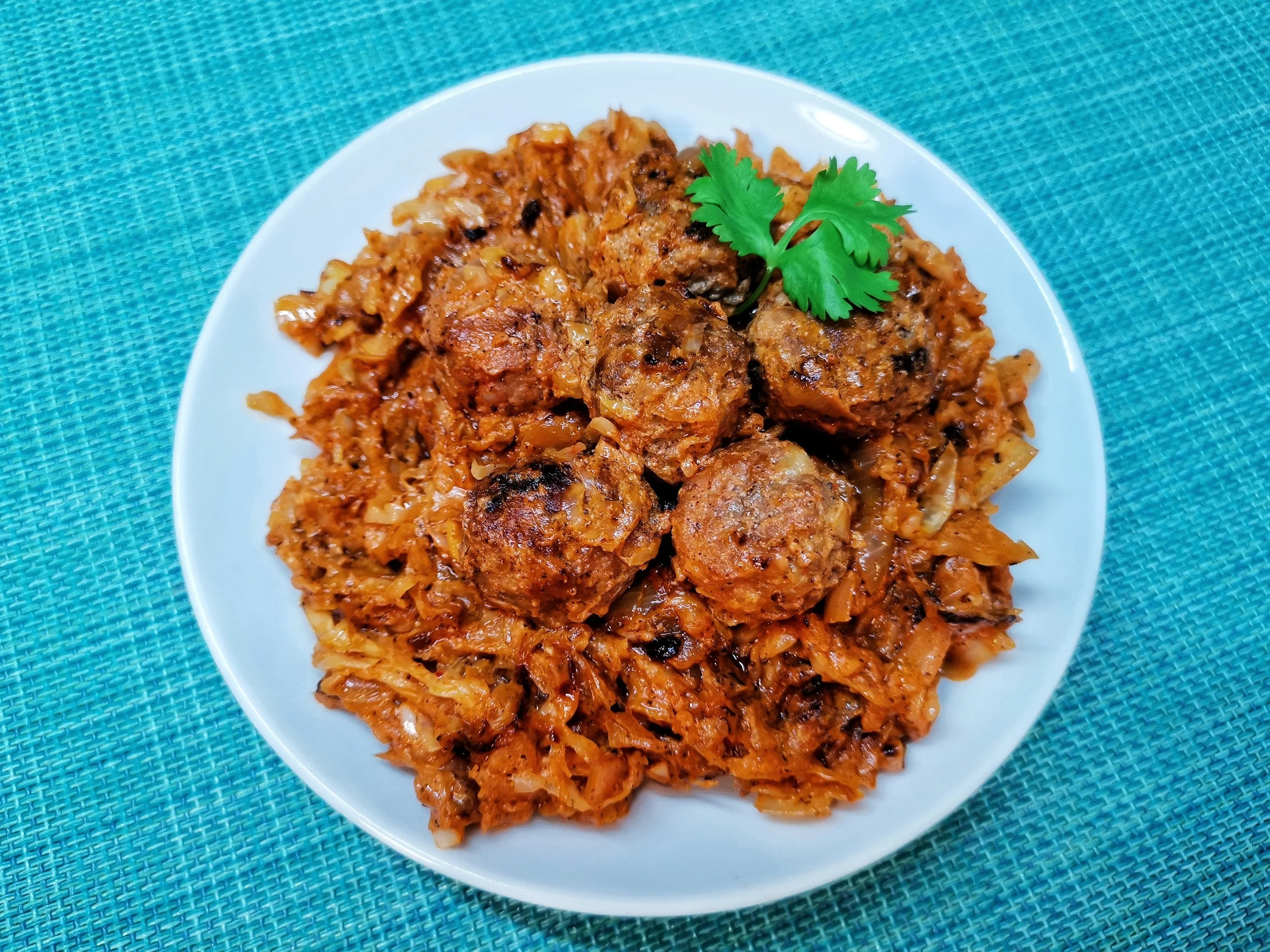 ШАГ 7 Через еще 2 минуты перемешать тефтели и лук, добавить сверху капусту и чеснок. Немного перемешать.