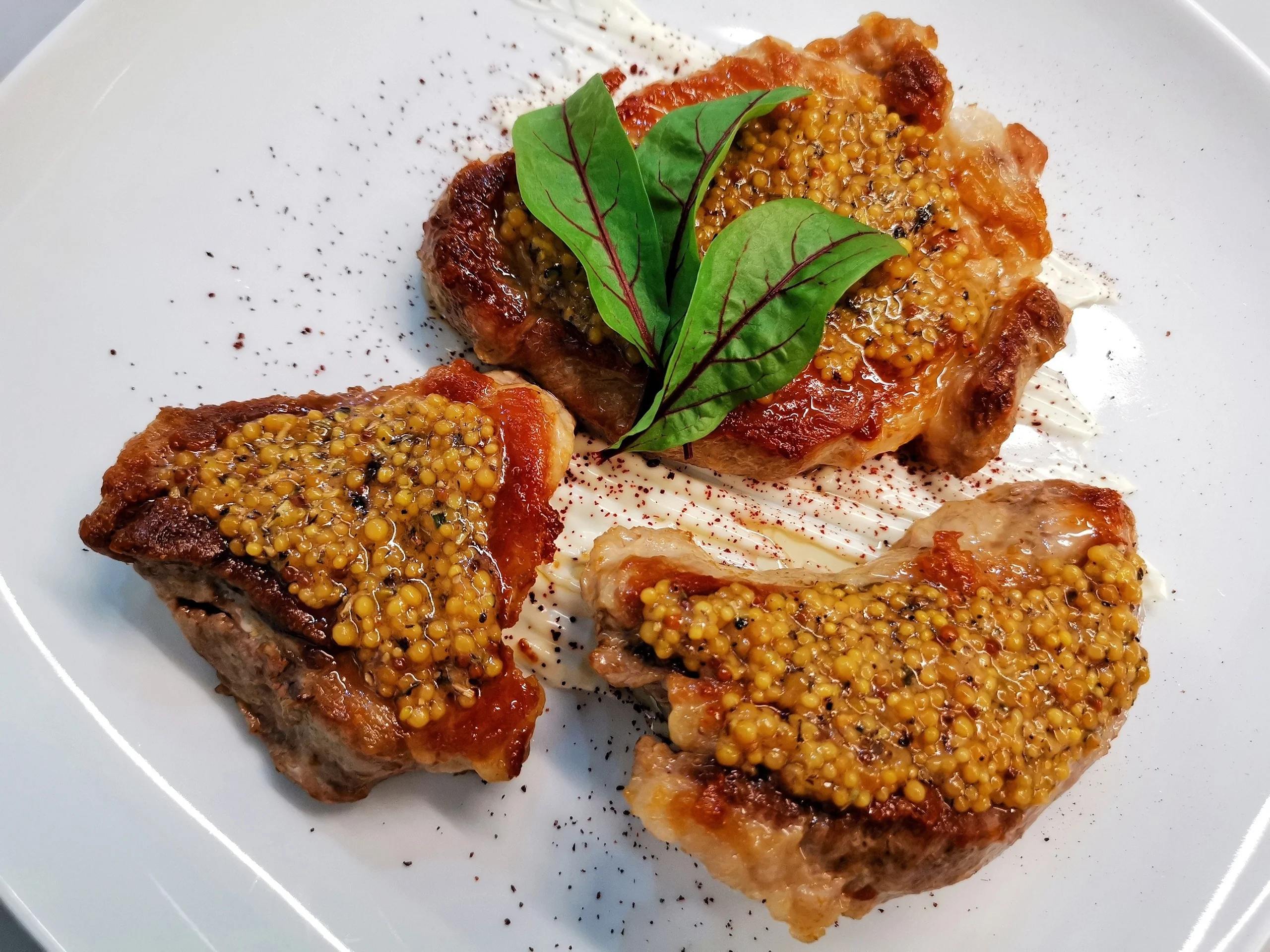 ШАГ 1 Мясо нарезать стейками толщиной около 2,5 см и смазать со всех сторон горчичным маслом.