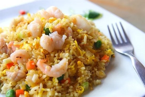Яйцо куриное Чеснок Растительное масло Лук репчатый Красный перец чили Креветочная паста Семена кориандра Сахар Креветки Свиное филе Длиннозерный рис Соевый соус Зеленый лук Латук Огурцы Основные блюда Индонезийская кухня