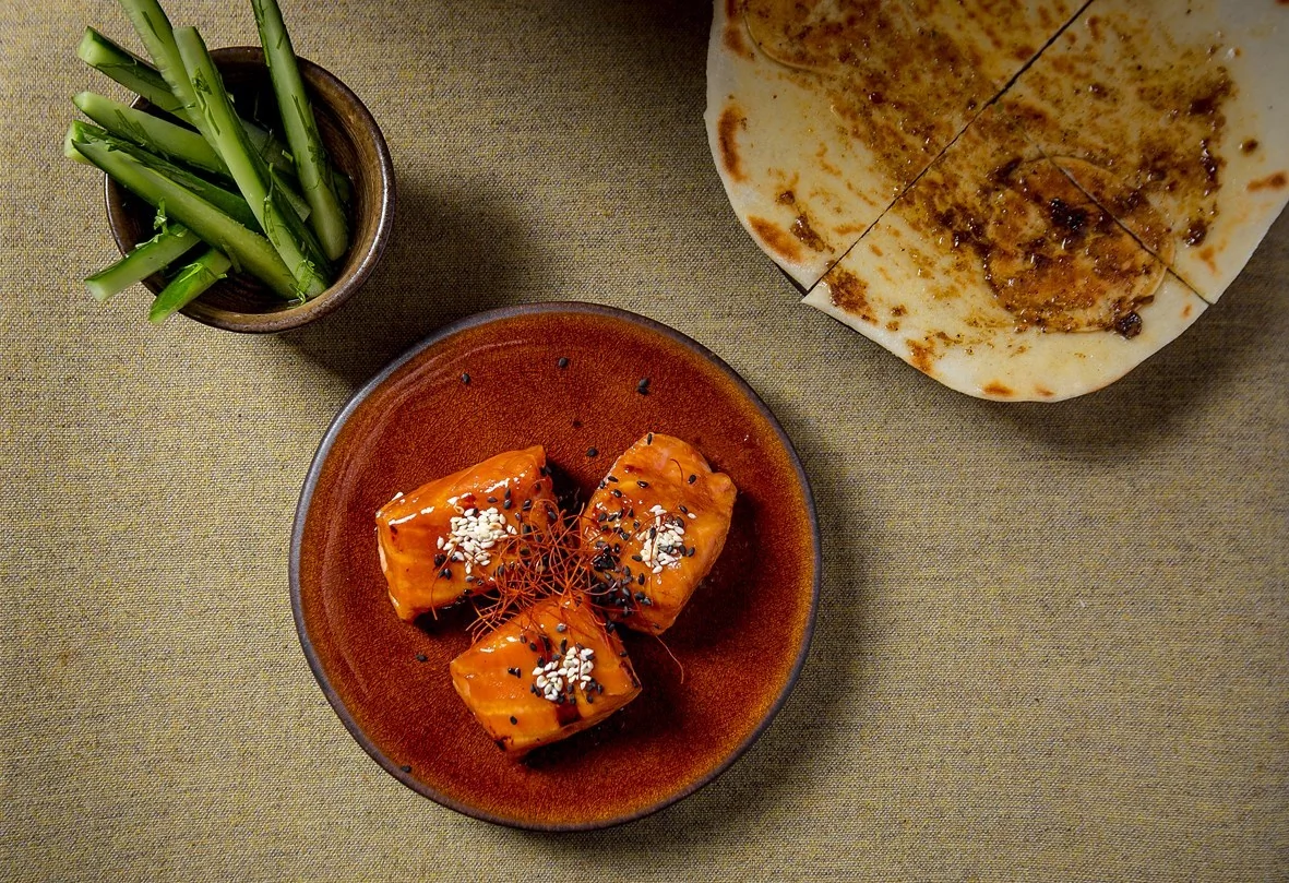 ШАГ 6 Филе лосося нарезать на куски 4×4 см, посолить, обмазать соусом кабаяки, выложить на пергамент и запечь в духовке в течение 12 минут при температуре 180 градусов.