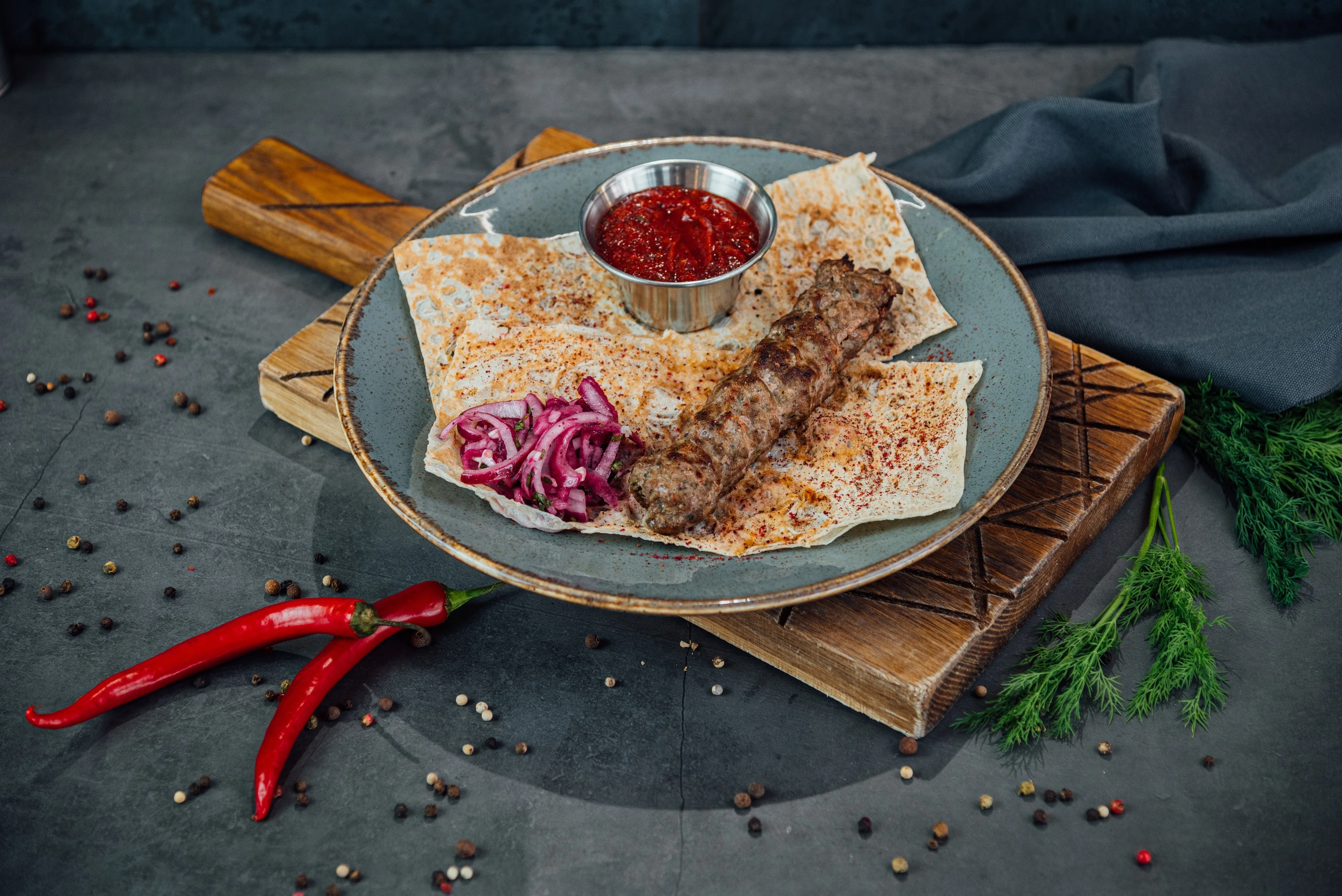 ШАГ 11 Подавать люля с маринованным луком, лавашом, аджикой и любимыми овощами.