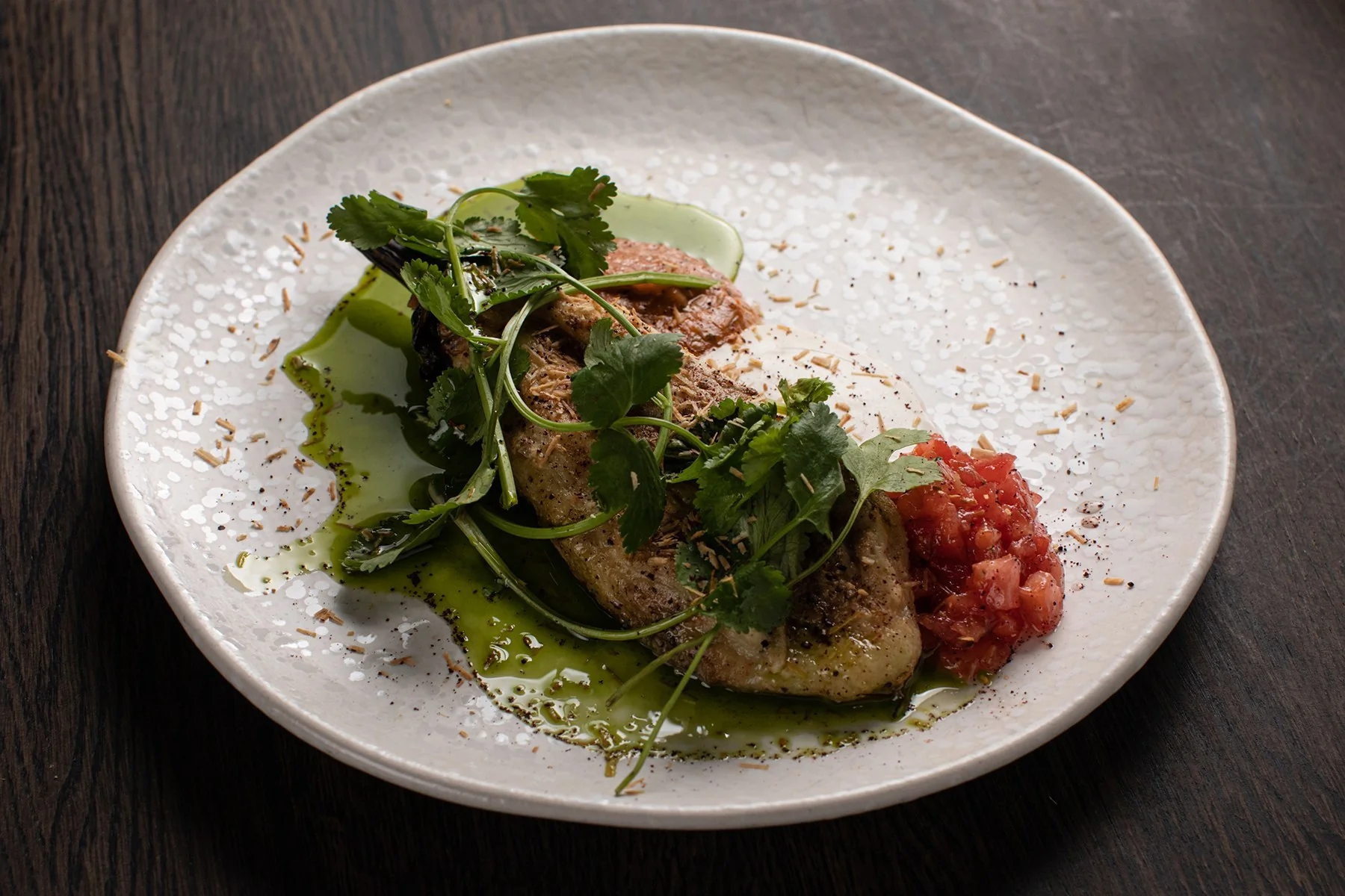 ШАГ 10 Перед подачей выложить на каждую тарелку прогретый баклажан со специями, рядом — пару столовых ложек томатной сальсы и сыра из кешью. Украсить кинзой.