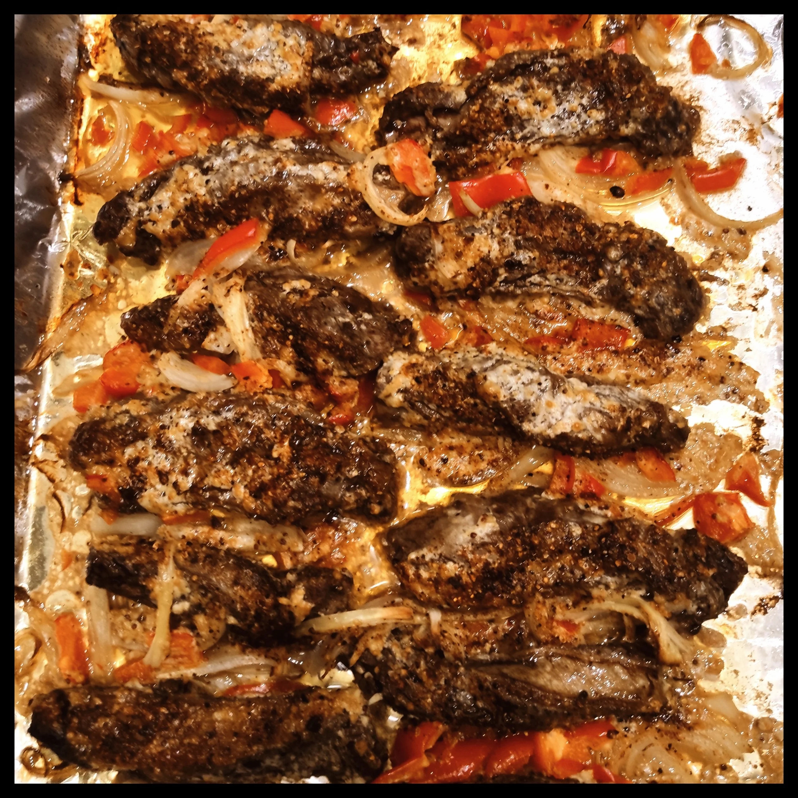 ШАГ 5 Смазать мясо оливковым маслом, выложить между стрипсами лук и перец.