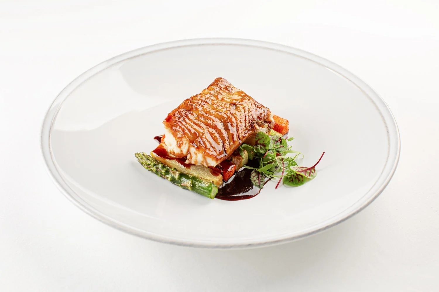 ШАГ 12 На дно тарелке, чередуя друг с другом, выложить брусочки овощей, сверху выложить рыбу, а по бокам — спаржу.
