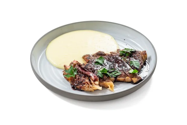 Стейк стриплойн с сырным пюре и соусом порто