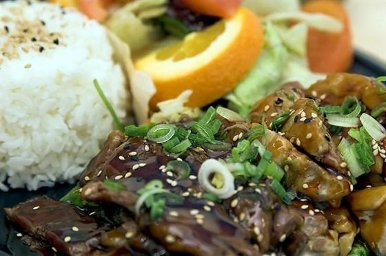 ШАГ 5 Порежьте каждый кусок мяса на полоски и разложите по 4 тарелкам. Полейте маринадом, посыпьте зеленым луком и кунжутом. Отдельно подайте салат.