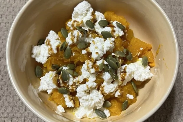 ШАГ 3 Выложить тыкву в миску. Затем измельчить рикотту. Посыпать тыквенными семечками. Полить финиковым сиропом и подавать к столу.