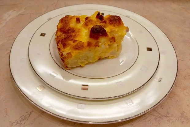 ШАГ 14 Часть соуса выложить на дно формы, на него цветную капусту, потом кубики ветчины, потом слои повторить.