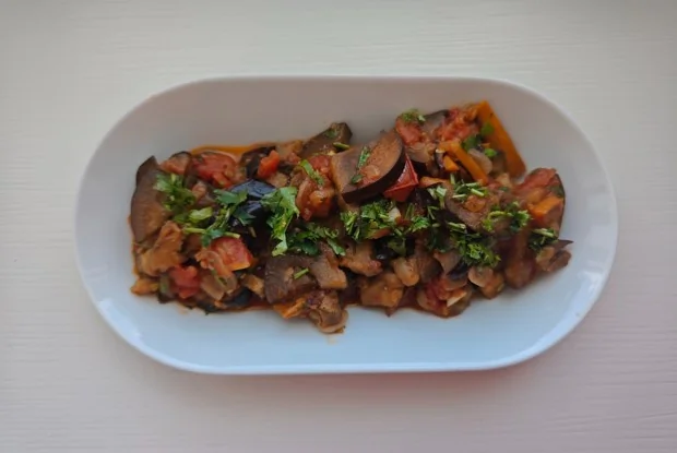 ШАГ 10 Помидоры добавить к баклажанам, тушить еще 3–5 минут.