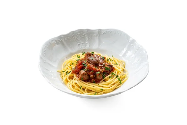 Тушеные куриные сердечки со спагетти