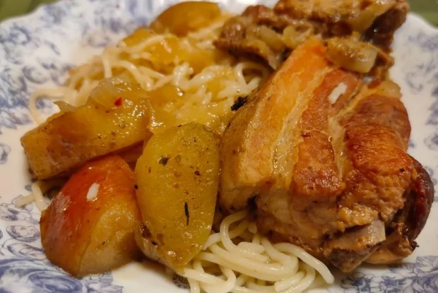 Свиные ребра тушеные с луком и яблоками