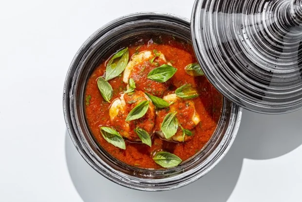 ШАГ 8 Выложить котлеты в тажин, добавить томатный соус, сверху полить оливковым маслом.