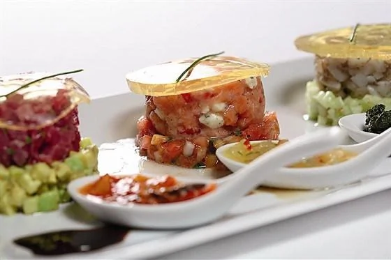 ШАГ 6 На порционную тарелку с помощью формочек выложить гарнир, поверх тартар из лосося, тунца и гребешка. Украсить шнитт-луком.