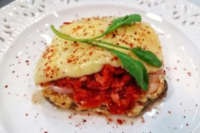 ШАГ 12 Затем переложить на блюдо и приправить хлопьями чили. Украсить зеленью и подавать.
