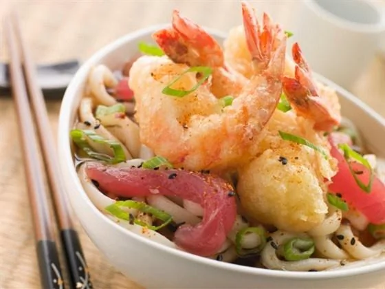 Жареная лапша удон с креветками, тофу и пореем