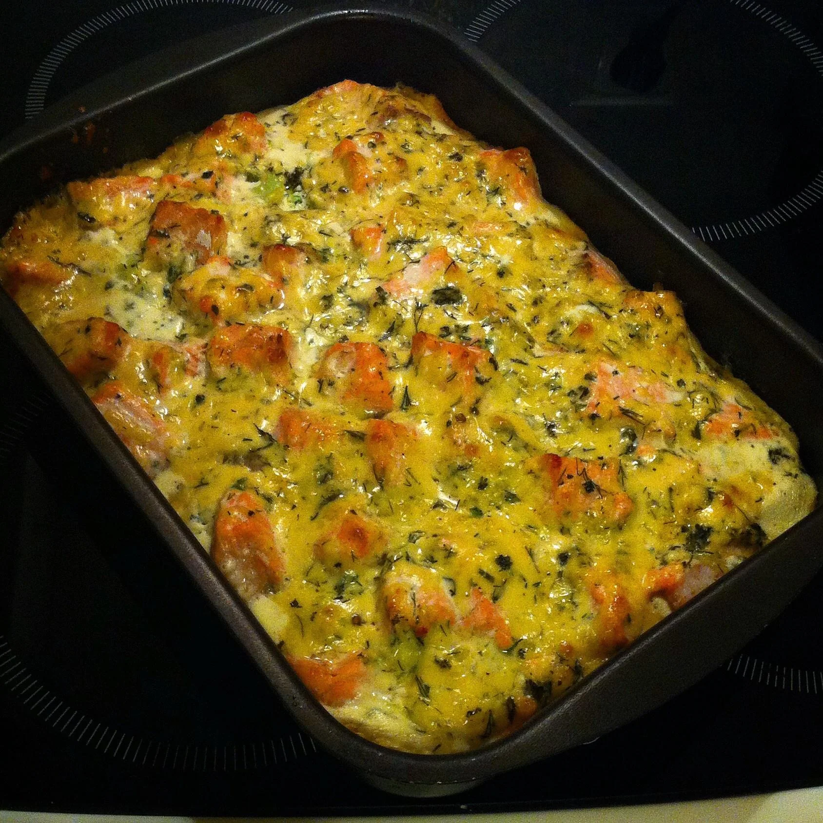 ШАГ 4 В смазанную маслом форму выложить слоями овощи и рыбу, залить сливочной смесью. Запекать 20 минут при 220° С.