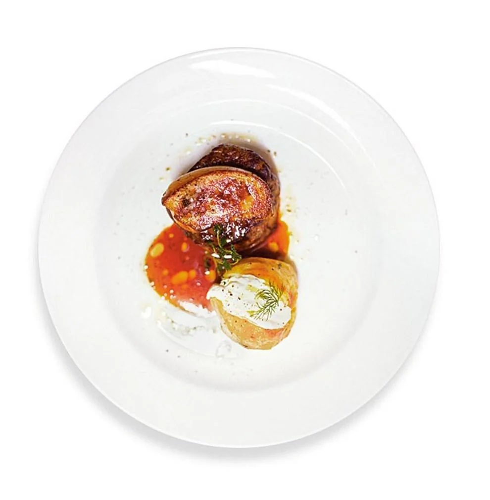 ШАГ 5 Когда все части блюда будут готовы, нужно выложить на тарелку мясо, сверху него — фуа-гра. Рядом выложить запеченную картофелину и ложку сметаны. Полить мясо соусом, сверху сбрызнуть трюфельным маслом.