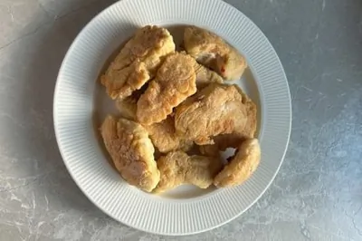 ШАГ 9 Разогреть масло. Каждый кусочек курица обвалять в муке и выложить на сковороду. Обжаривать по 7-10 минут на небольшом огне, переодически переворачивая.