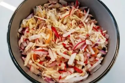 ШАГ 1 Редис нарезать тонкой соломкой.