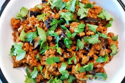 ШАГ 5 Через 1 минуту баклажаны снять с огня и переложить в миску. Добавить на ту же сковороду немного масла и выложить фарш. Усилить огонь.
