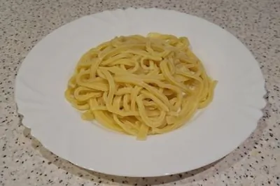 ШАГ 11 В кастрюле вскипятить воду, посолить по вкусу, добавить 10 мл оливкового масла и выложить нарезанные макаронины. Варить примерно 3–5 минут. Выложить в тарелку, добавить 50 грамм сливочного масла.