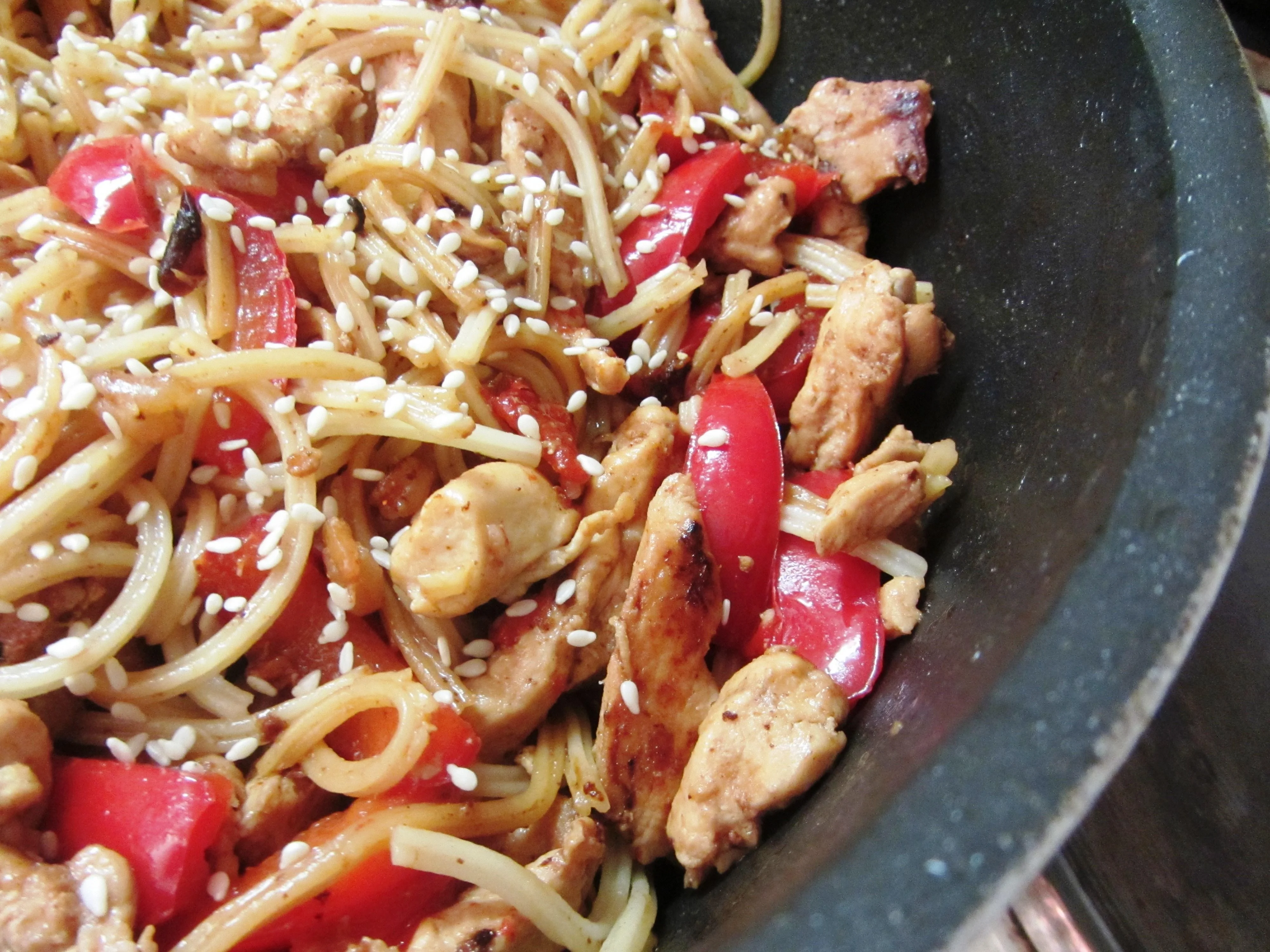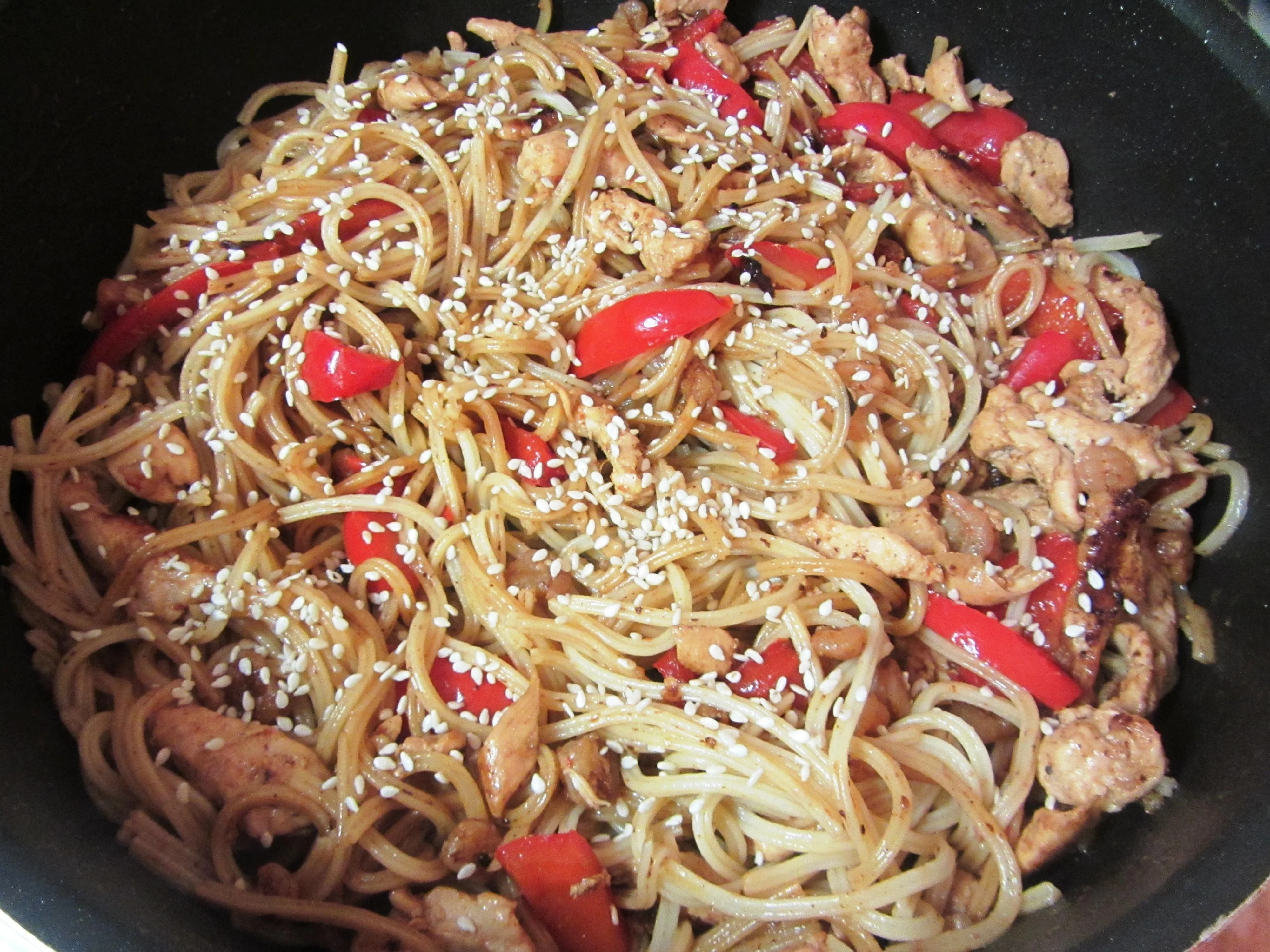 ШАГ 3 Разогрейте вок на среднем огне 1-2 минуты до появления дымка и добавьте растительное масло. Добавьте курицу, нарезанную полосками, и перцы, нарезанные кубиками, и жарьте 2 минуты. Затем выложите лапшу с овощами и готовьте еще 3 минуты. Введите слегка взбитые яйца и жарьте, пока яйца не будут готовы.