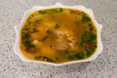 ШАГ 10 Добавить в кастрюлю подготовленные зелень, чеснок и перец. Все аккуратно перемешать, довести до кипения, снять пену, при необходимости досолить. Варить на среднем огне еще примерно 5–7 минут.