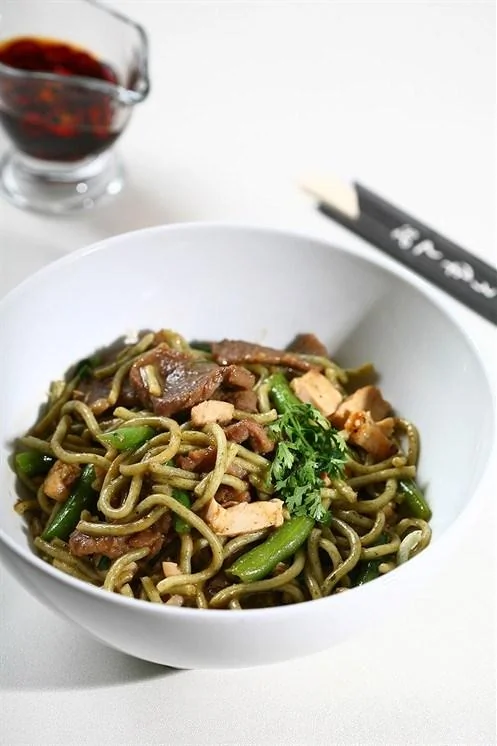 ШАГ 3 Добавьте соль, сахар и соевый соус, затем сбрызните кунжутным маслом. Выложите на лапшу и посыпьте зеленым луком.