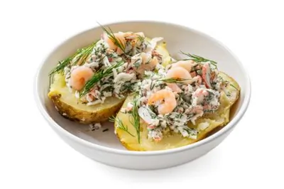 ШАГ 10 Разложить готовый картофель на тарелки, из расчета 1 клубень на порцию, положить на каждую половинку щедрую ложку начинки, по желанию можно украсить готовое блюдо креветками или укропом.