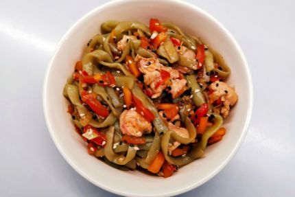 ШАГ 12 Добавить лапшу на сковороду. Перемешать, увеличить огонь и обжаривать, помешивая, 2–3 минуты. Подсолить по вкусу.