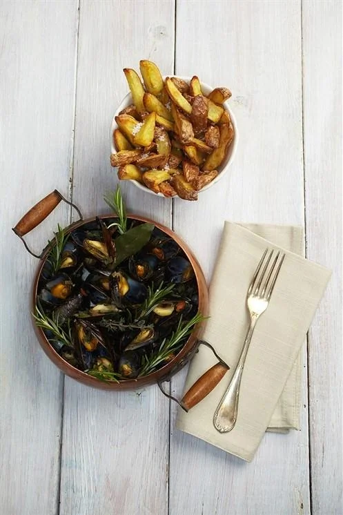 ШАГ 4 Переложите мидии в небольшую сервировочную кастрюлю, украсьте веточками свежего розмарина. Подавайте с картофельными чипсами и соусом из крем-фреш.