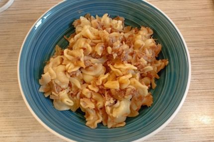 ШАГ 11 Переложить макароны в сковороду. Перемешать. Накрыть крышкой и подержать на малом огне вторую половину времени для варки макарон.