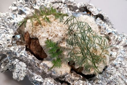 ШАГ 10 Аккуратнее: картошка в фольге очень горячая. Сверху картофель заправить сметанным соусом, приправить черным перцем и подавать.