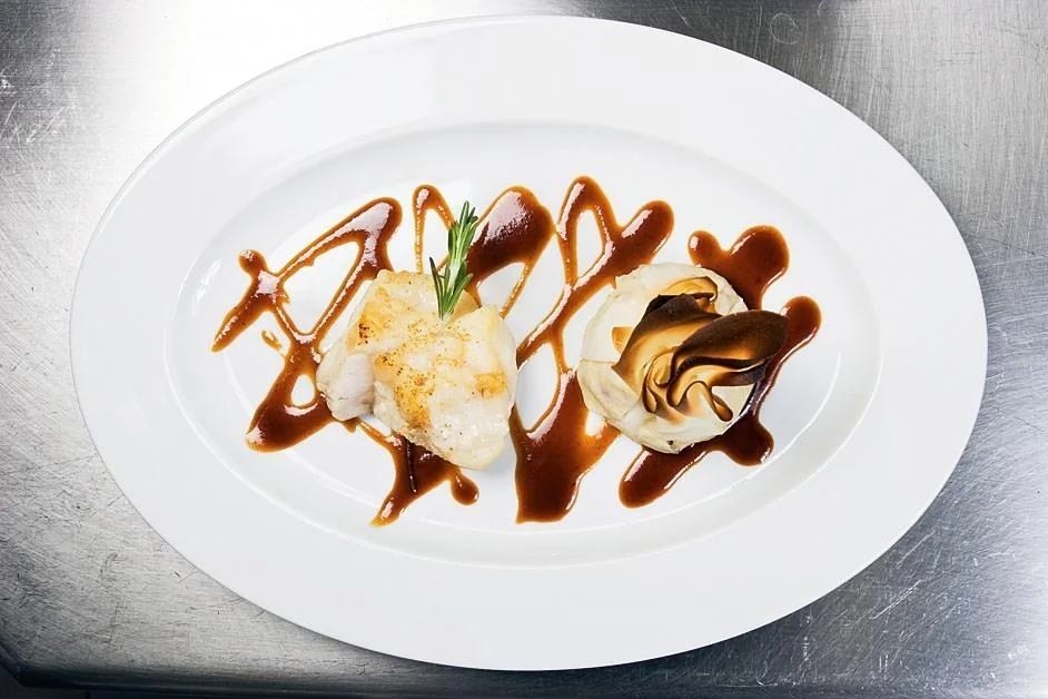 ШАГ 8 Красиво разлить по большой тарелке демигляс. С одной стороны выложить ризотто, с другой — морского черта. Филе можно разделить на две части, чтобы удобнее было есть. А ризотто пришпилить веточкой тимьяна.